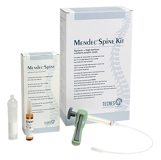 Didesain untuk memenuhi kebutuhan kyphoplasty dan vertebroplasty, Mendec Spine KIT adalah sistem yang akurat dan mudah digunakan. Sistem lengkap ini memiliki kontras sinar-X yang sangat baik dan memberikan ekstrusi resin yang akurat dan sederhana. Bahkan sejumlah kecil resin terlihat dan tersedia untuk pengukuran instan. Kit dapat digunakan tanpa unit eksternal dan ekstrusi dan persiapan resin.